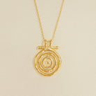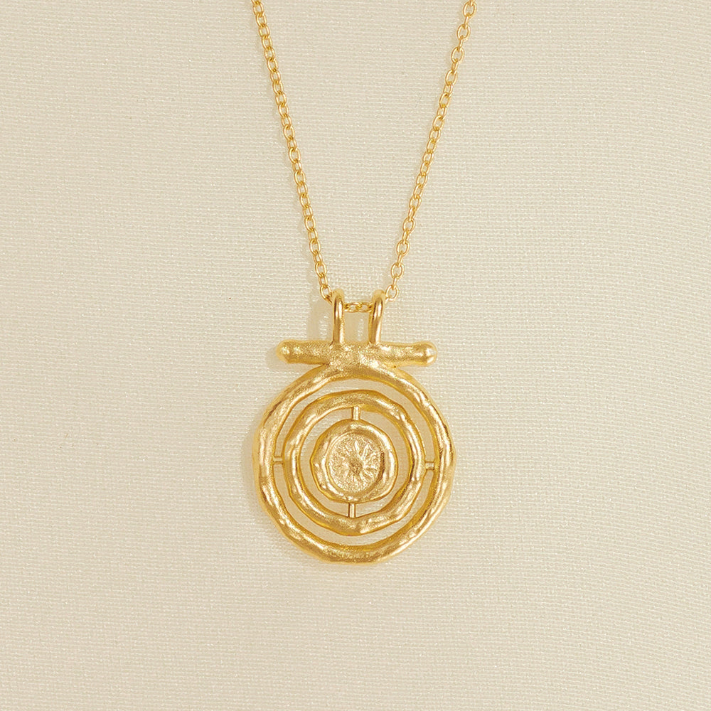 Our Gali pendant features a sun spinning within a rotating golden frame, like an astrolabe (a “star-taker”) or a gyroscope (an intricate design for maintaining orientation).