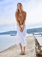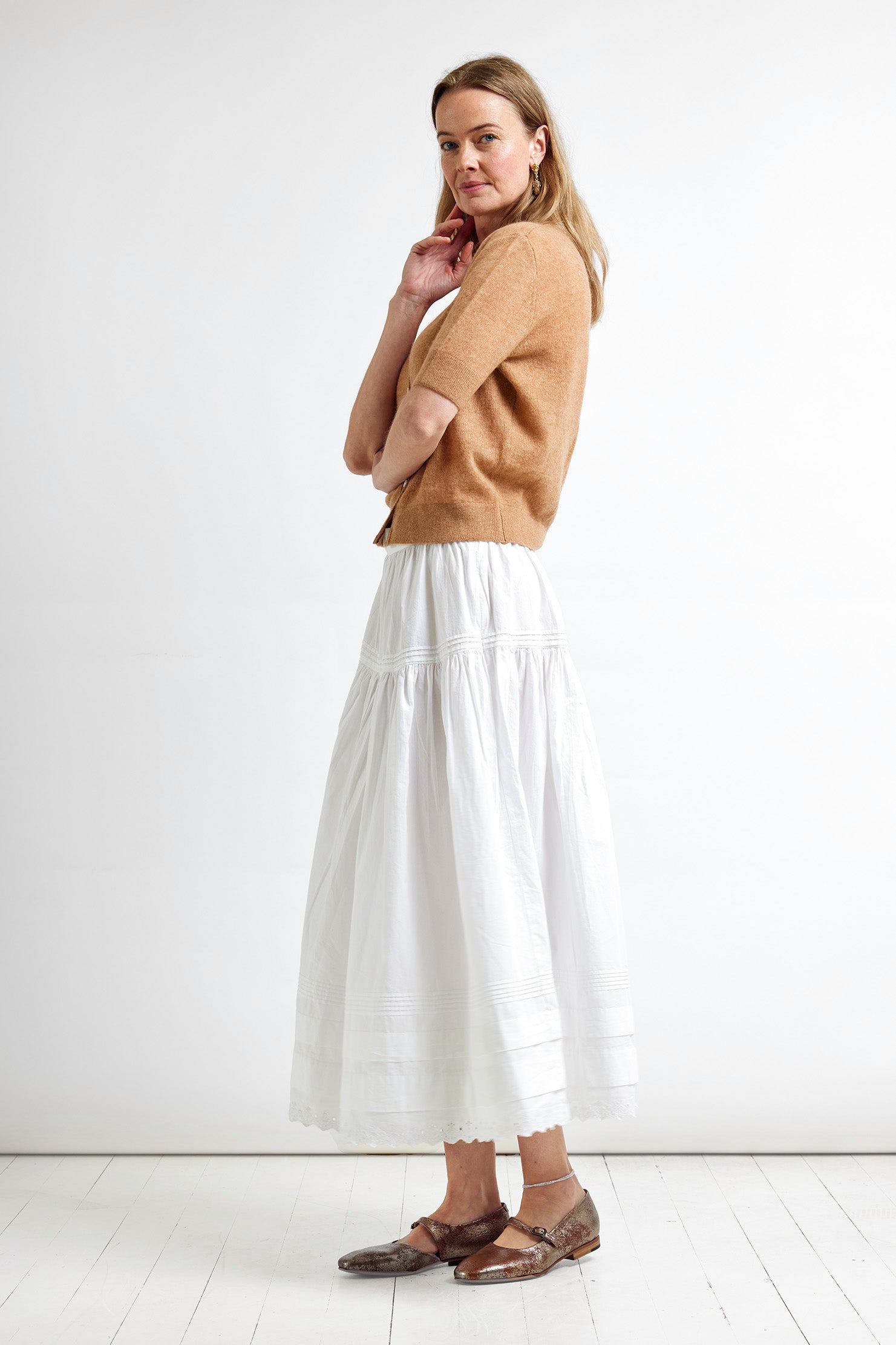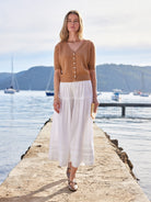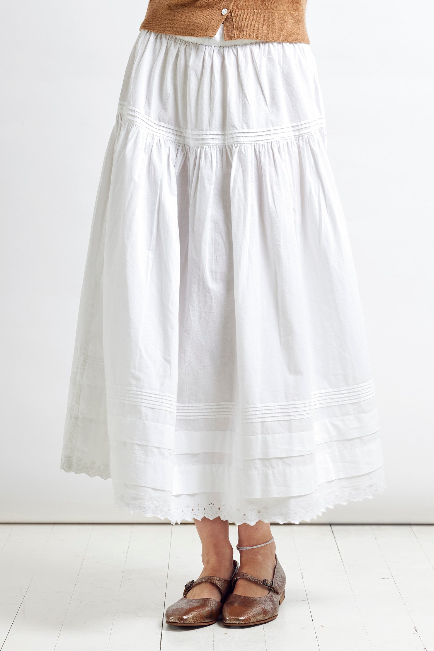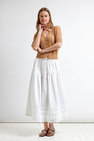 Layers of sumptuous cotton poplin and broidery anglais define this crisp white skirt that reminds us of muses from France in the 60's. Eternally gracefully and effortlessly light and floaty this skirt looks polished in winter with boots and a cardigan and then in summer with a simple tank and sandals.