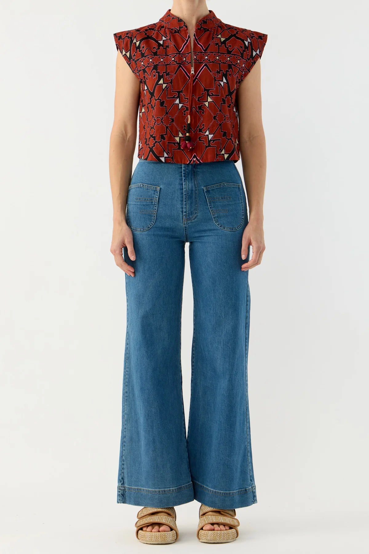 The Jericho Vest blends structure with artisanal detail, cut from cotton-flax and woven with an embroidered paprika motif for rich texture and depth. A cap sleeve grounds the silhouette, while front zip closure adorned with an intricately beaded tassel lends movement and artistry to layering.