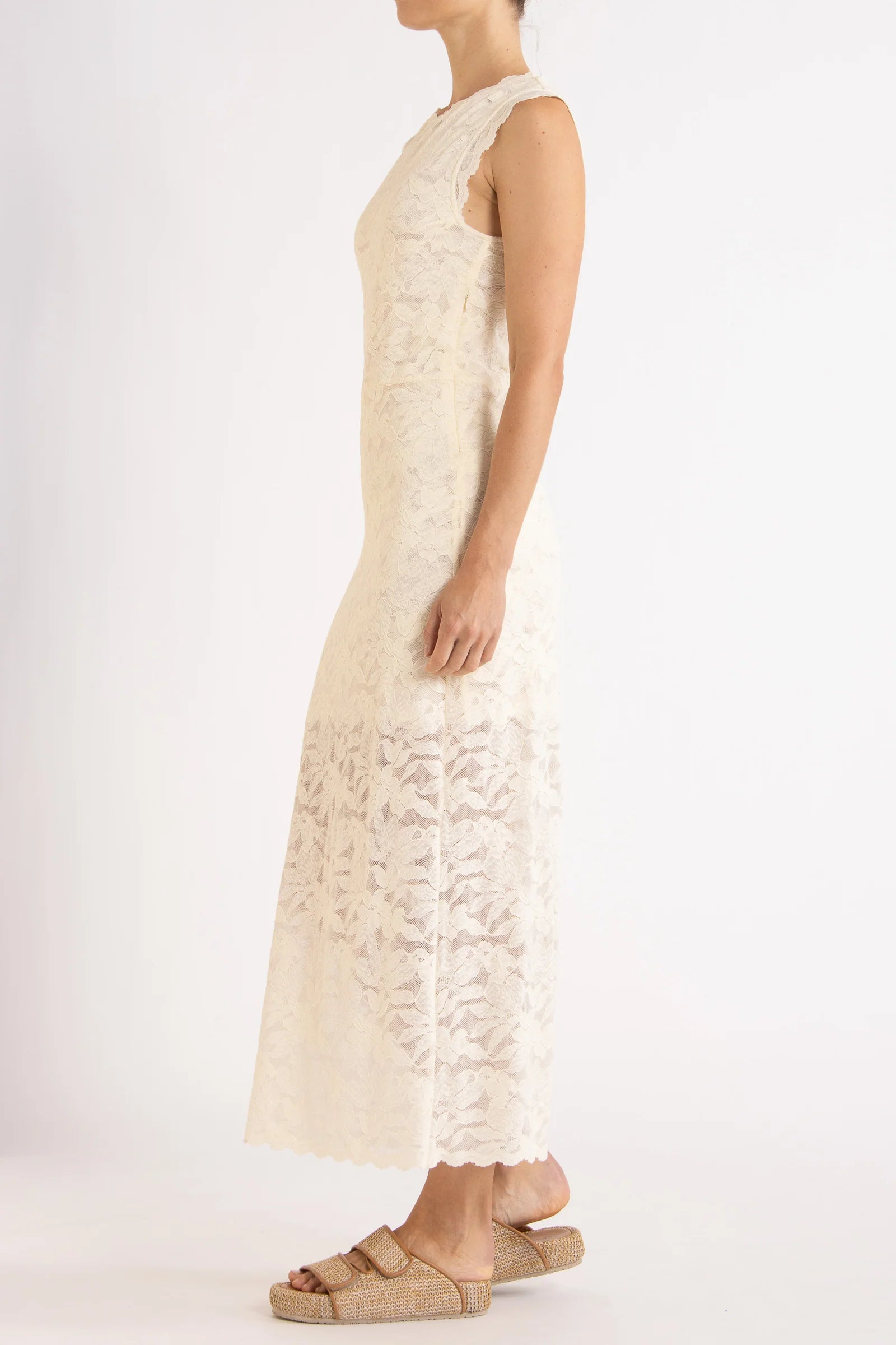 The Erika Sleeveless Dress in pearl is softly sculpted from floral stretch lace, fitted through the body with graceful ease. The sleeveless silhouette highlights the delicate texture of the lace, creating a look that feels light and feminine. Timeless and romantic, it’s an effortless expression of understated elegance.