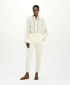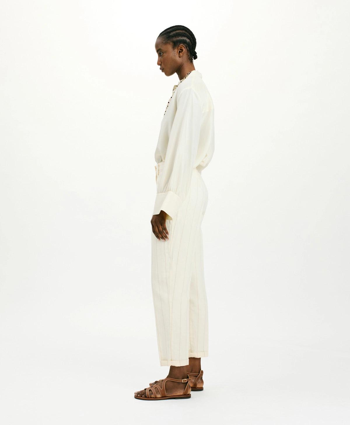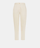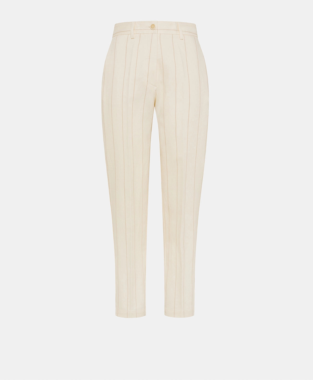 Cigarette trousers in pinstripe cotton and linen fake denim. Regular waist and crotch, relaxed fit, slant pockets, waistband with belt loops, pressed crease.