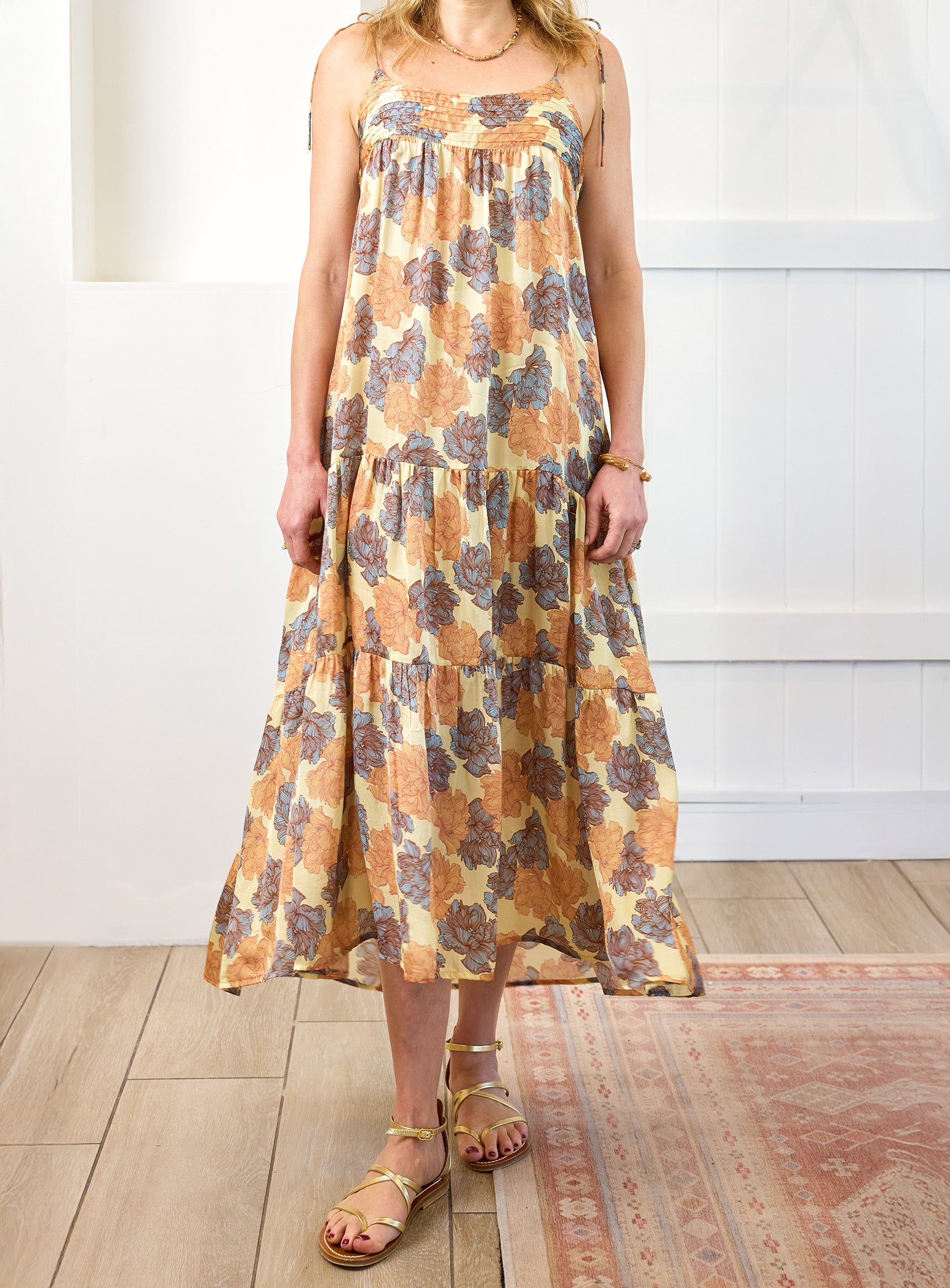 The flow of this dress is magical, fluid and tired with a delicate shoulder tie detail in a gorgeous buttery blue and caramel print. This dress will take you anywhere from everyday effortless chic to a garden party.