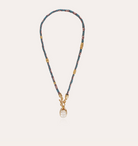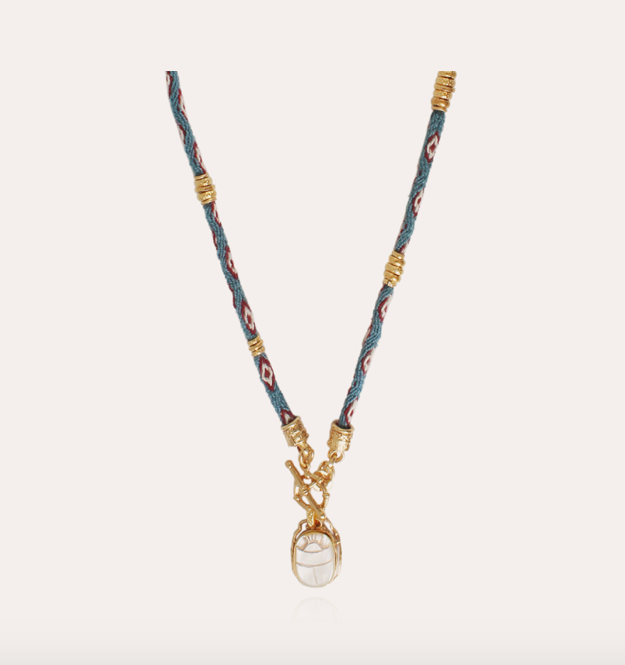 Necklace made of hand-woven alpaca fiber, adorned with gold plated ornaments and adorned with white Mother-of-pearl beetle pendant.