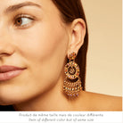 Gold-plated earrings inspired by a trip to Byzantine lands and a reinterpretation of a vintage model by the Marseillaise fashion house. They feature a round centerpiece and are adorned with enameled tassels and cabochons, evoking the sun.