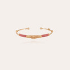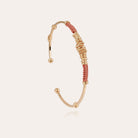 Gold plated bangle, wrapped in part by colored threads and golden rings. You can stack it with other bracelets to create a summery arm candy. Adjustable size.