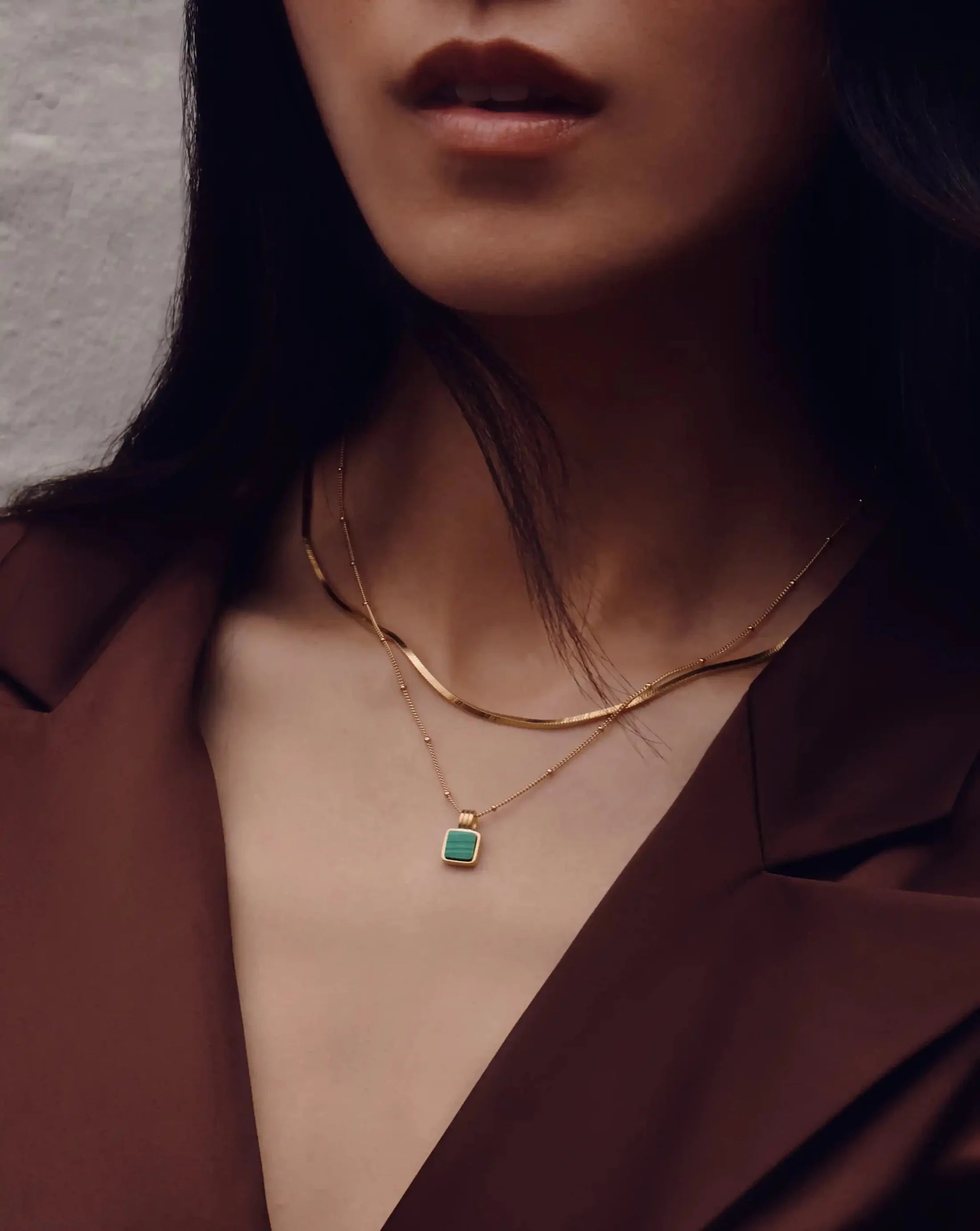 A semi-precious addition to your layers. Paired with a delicate chain, the square malachite pendant, known as the transformation stone, creates a distinctive focal point. Layer this best selling piece with a longer necklace or coin choker for a Lucy Williams duo you'll never take off. Layer for less when bought as a set Iconic Lucy Williams Malachite Necklace Set.