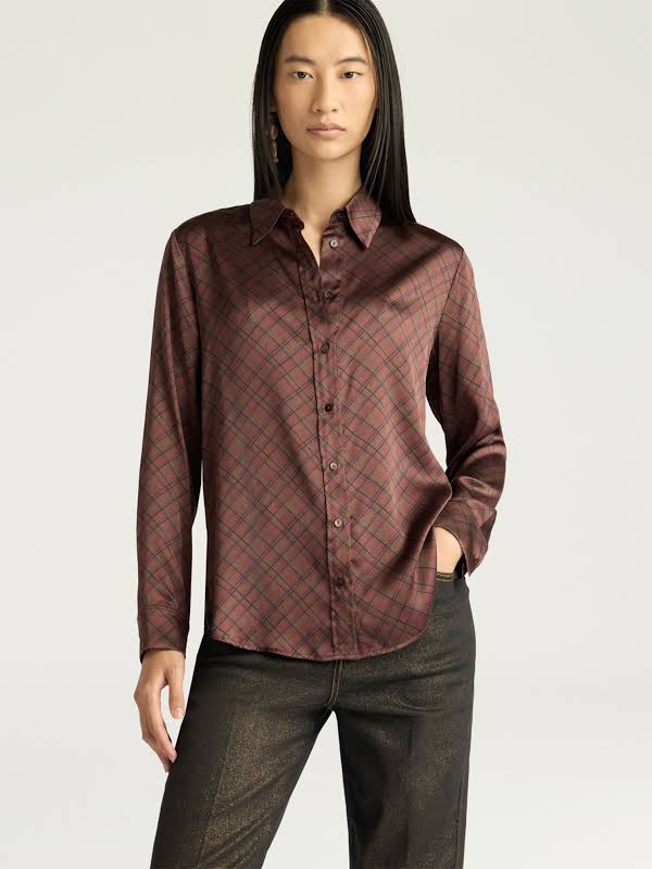 Fitted shirt in printed stretch pure silk satin. Cora features slim, masculine lines with rounded hem and twin-needle top-stitching