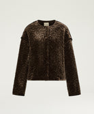 Short round neck padded jacket in viscose silk blend velvet quilted with exclusive Momonì logo pattern. Boxy cropped fit with topstitched edges Velvet - covered snap button fastening. Side seam pockets.