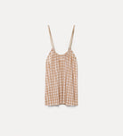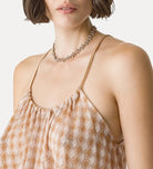 Like a petal gently resting on the skin, this elegant top plays with minimal shapes and a shimmering fabric finish. the thin strap supports a gathered neckline that creates soft volume on the bust, while the geometric pattern lights up with a lurex thread woven through the fabric.