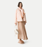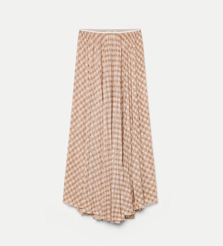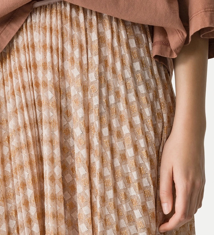 This pleated skirt in diamond jersey shimmers with a subtle lurex thread. the small elastic waistband and the flared volume at the hem play with the refined elegance of a soleil pleat.