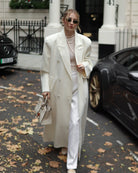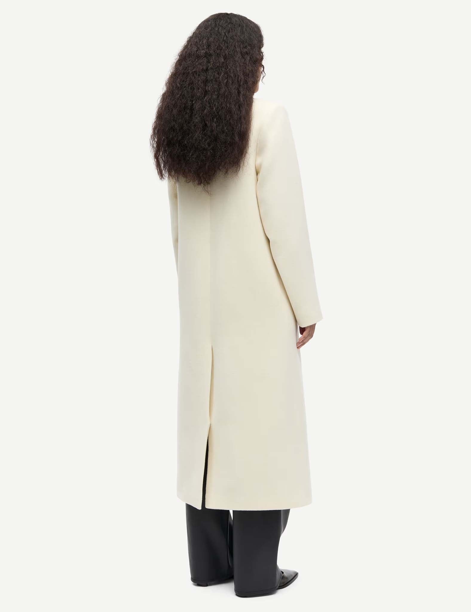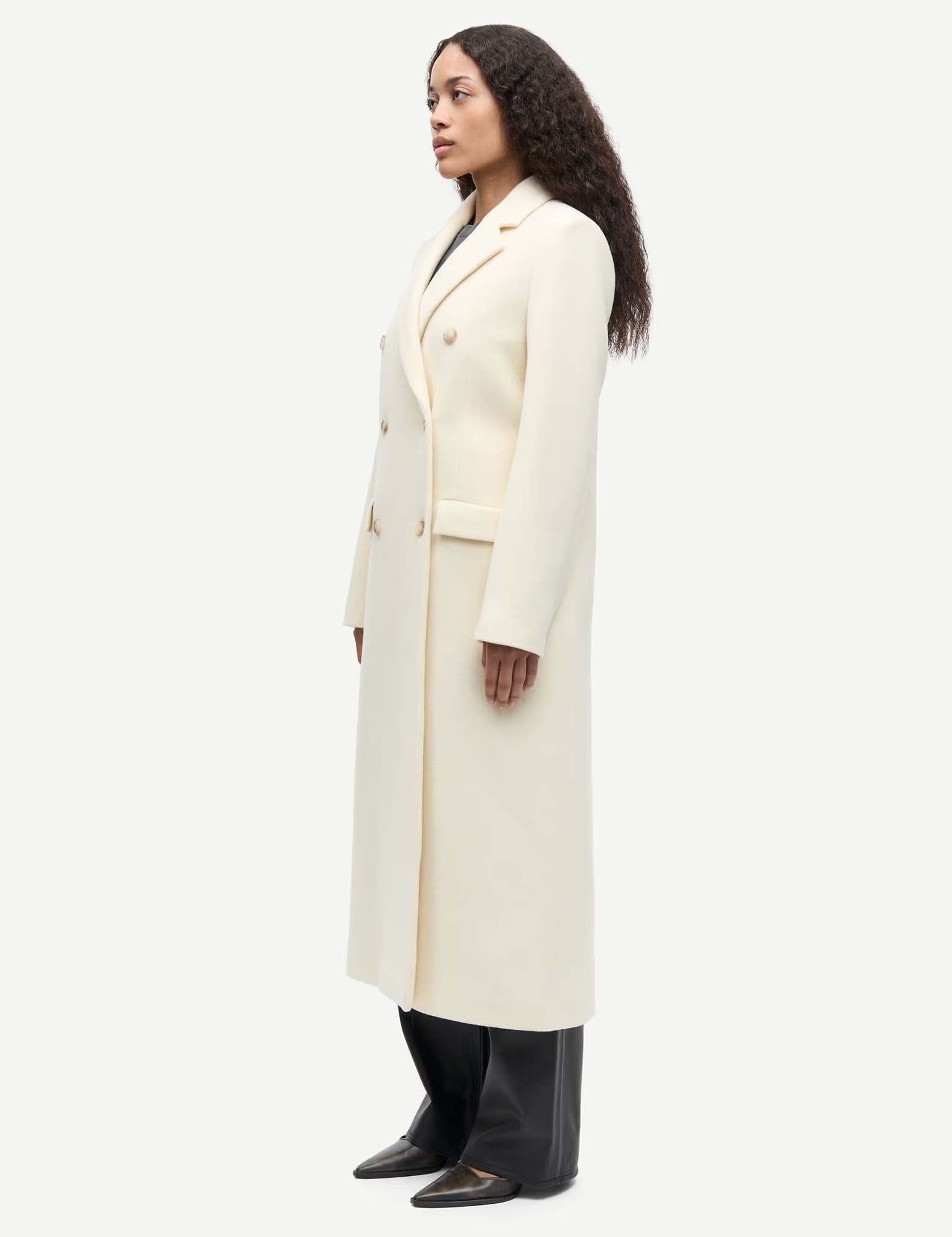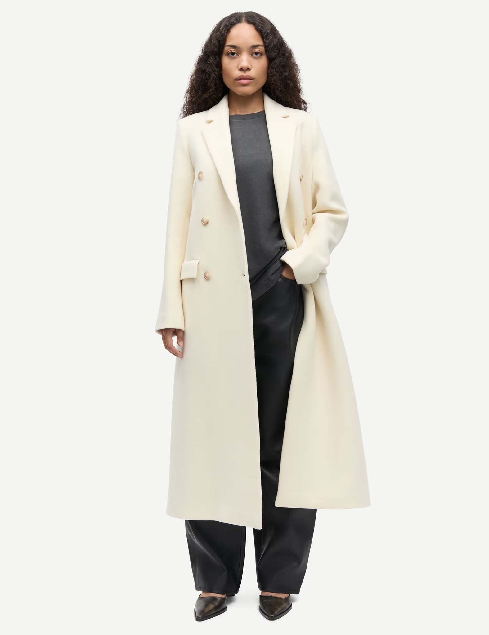 Long coat with a straight fit. Double-breasted button closure on the front. Flap pockets on the front. Notched lapel collar. Long back hem vent. Fully lined. Main material woven in Italy from a blend with recycled wool and recycled polyester.