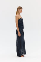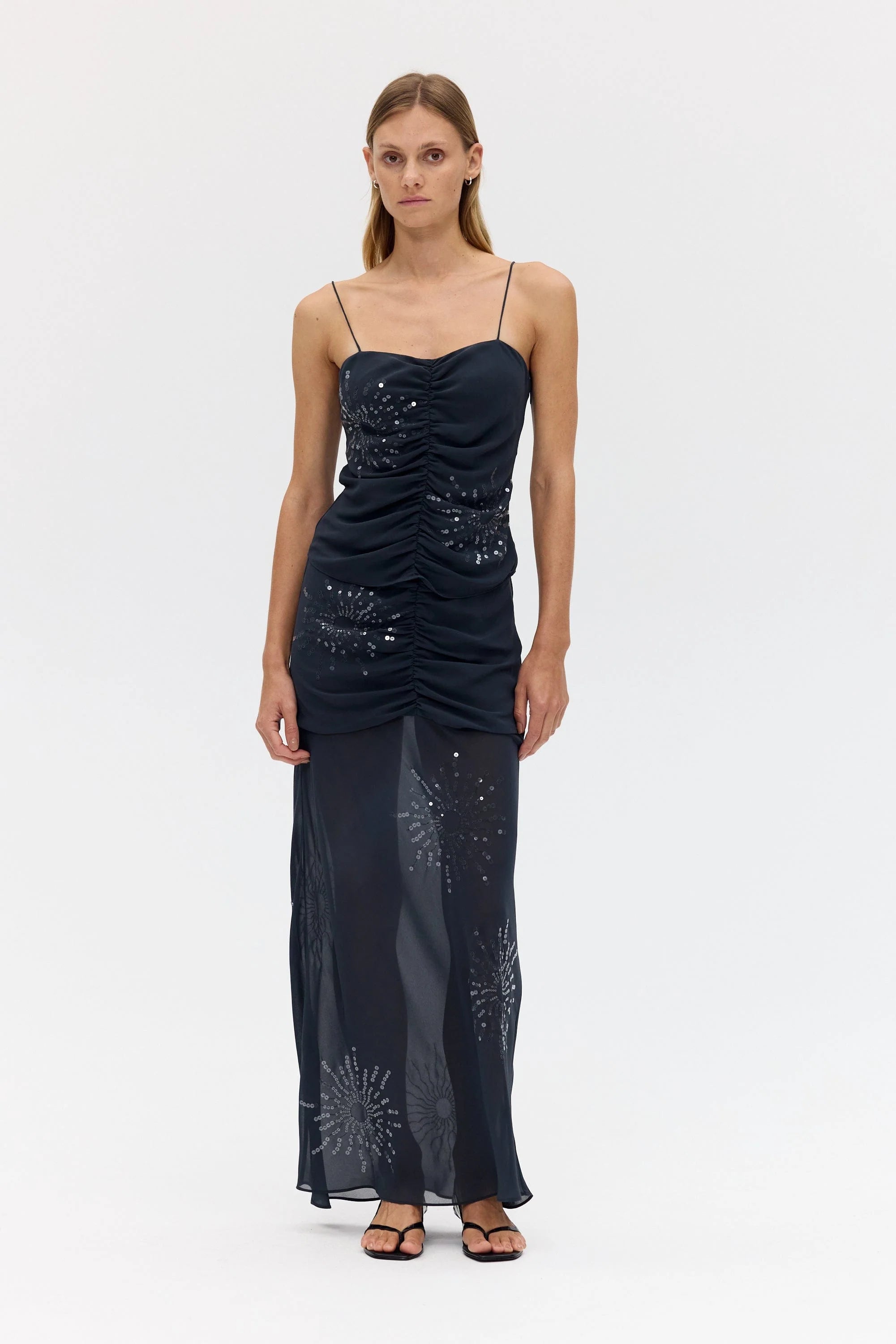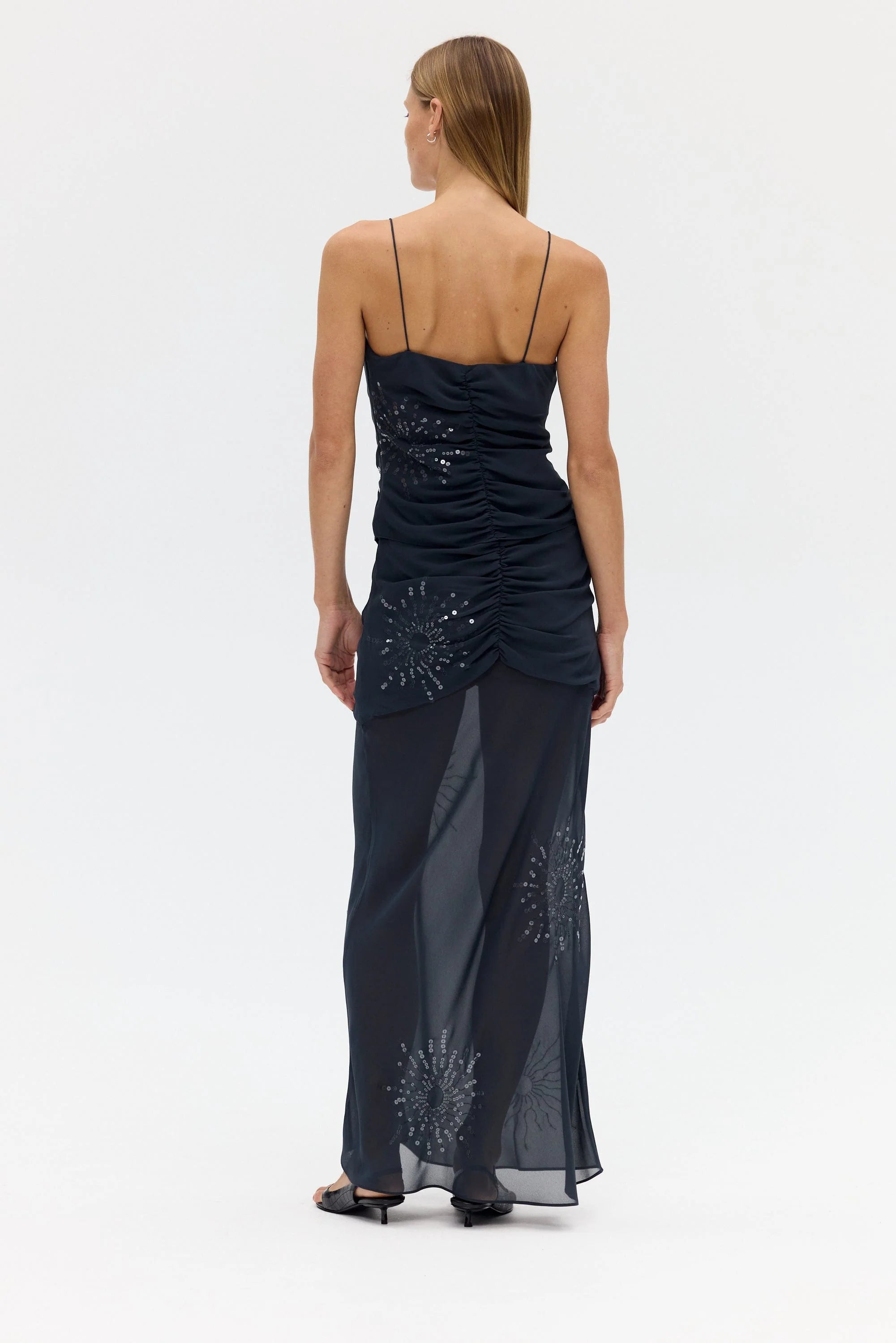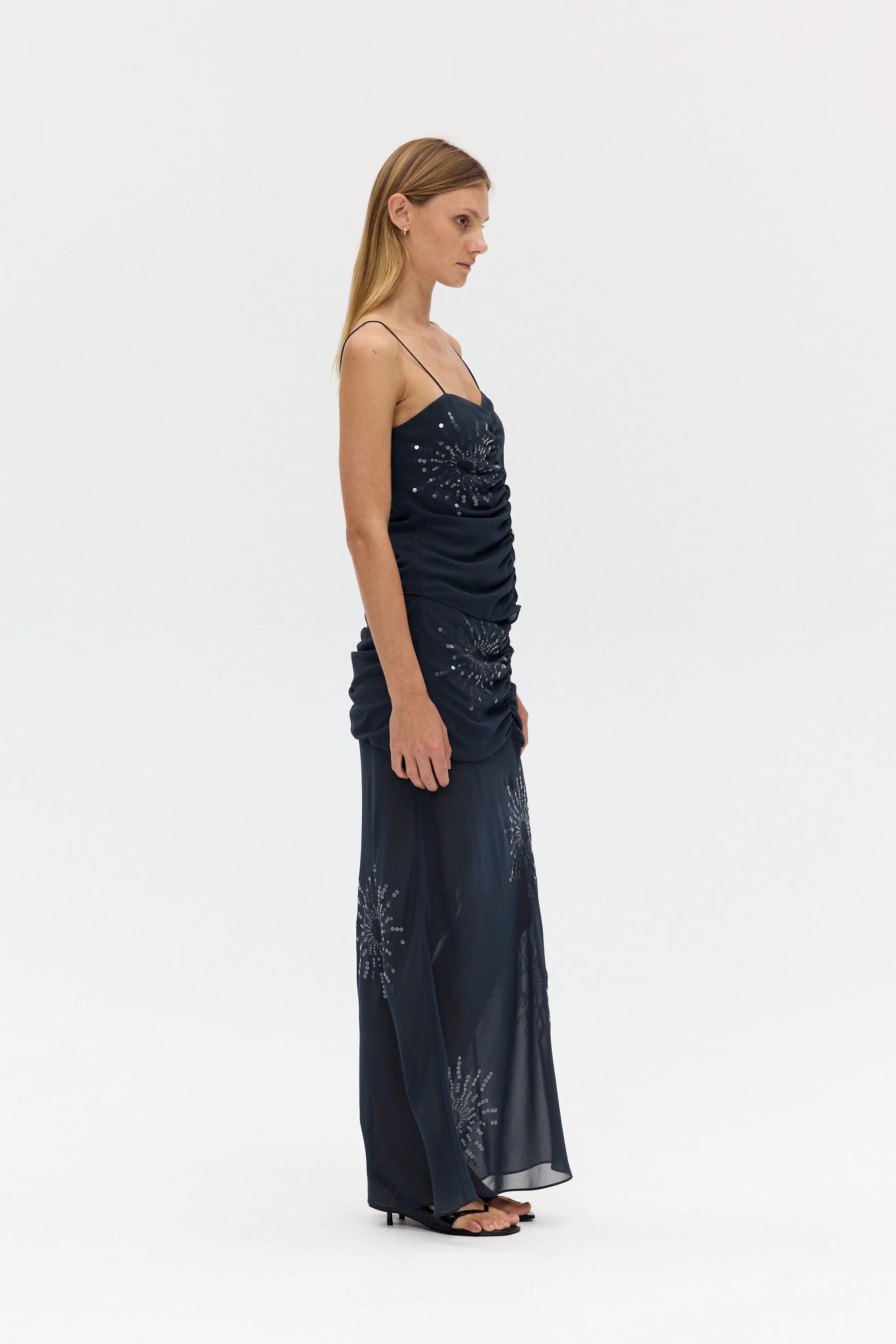 The Flicker Bias Maxi Skirt plays with light and texture through a fluid, elongated silhouette. The slim fit through the upper body falls to a gentle flare at the hem, cut on the bias for natural drape and movement. The sheer lower skirt reveals subtle transparency, creating a layered interplay of opacity. Adorned with an exclusive sequin pattern designed in house, this piece embodies modern occasion dressing with refined ease.