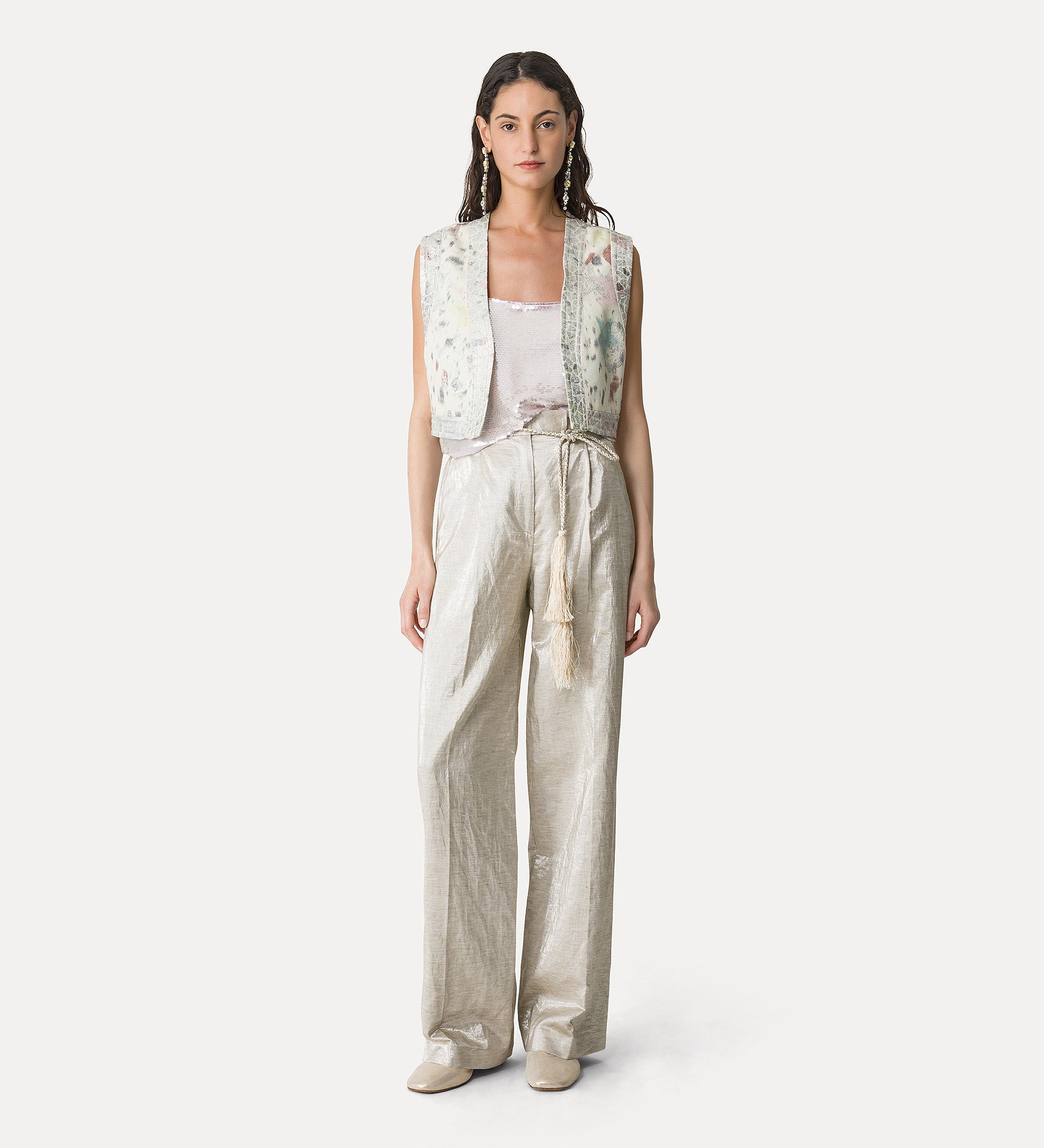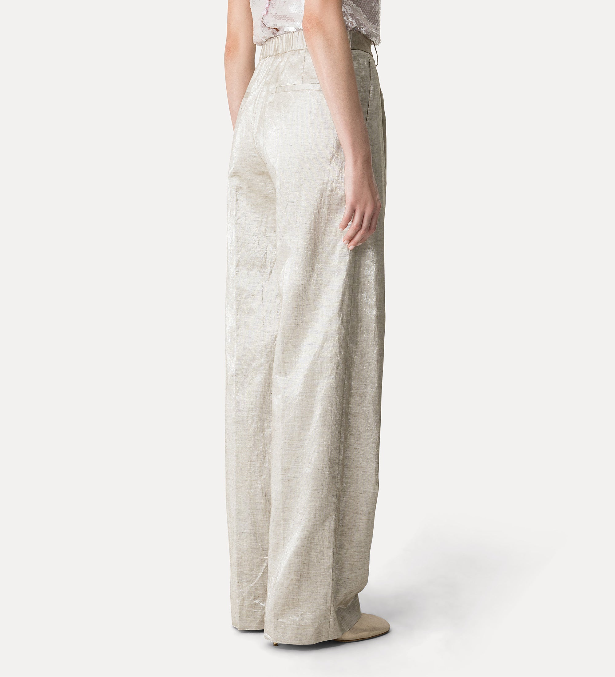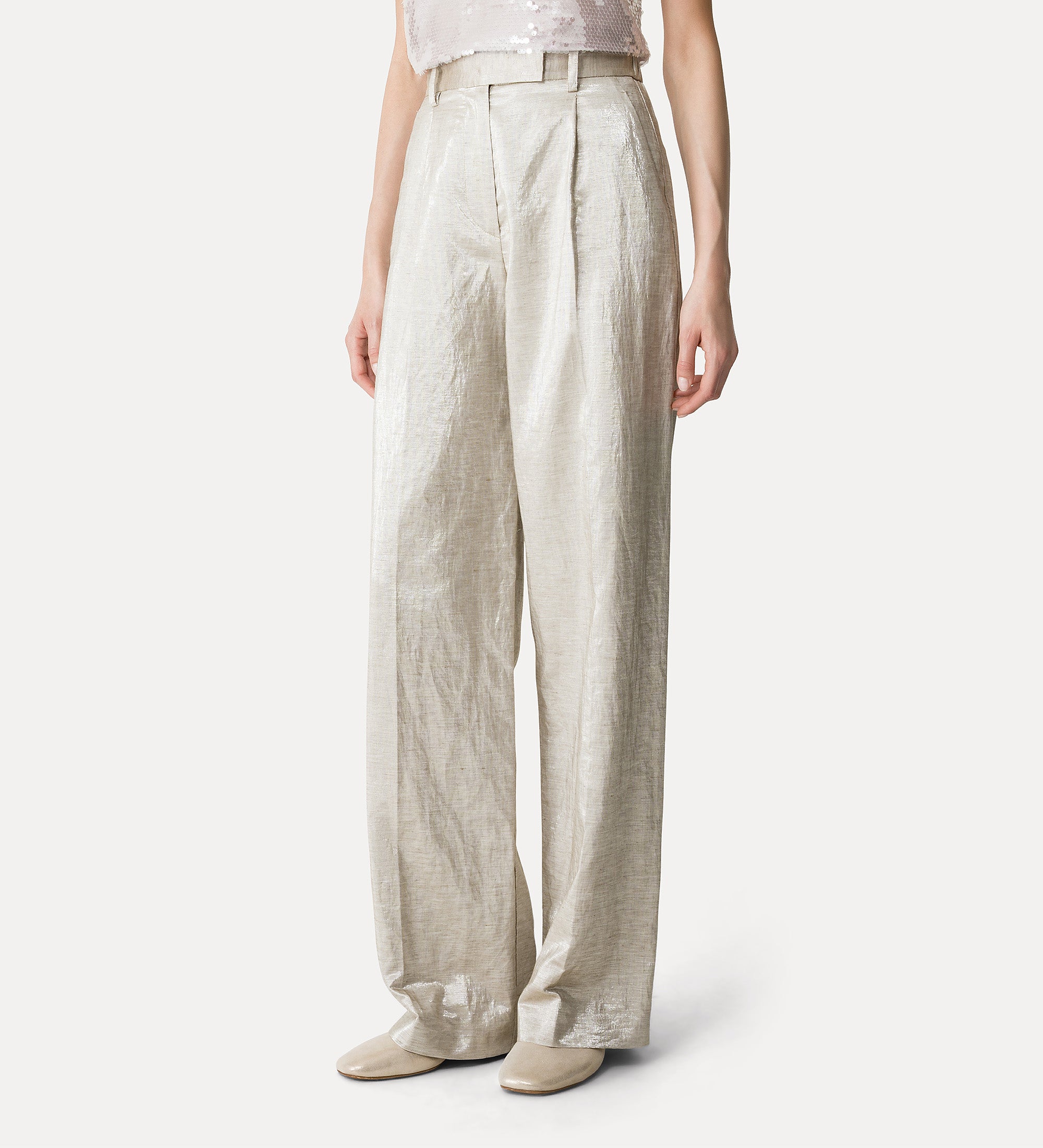 the summery allure of linen meets the luminous glow of lurex: these new high–waisted trousers boast flowing lines along the legs and construction inspired by male tailoring. the ironed pleats and welt side pockets evoke a fresh, playful mood, emphasised by the bright finish of the fabric.