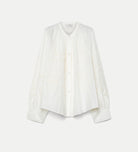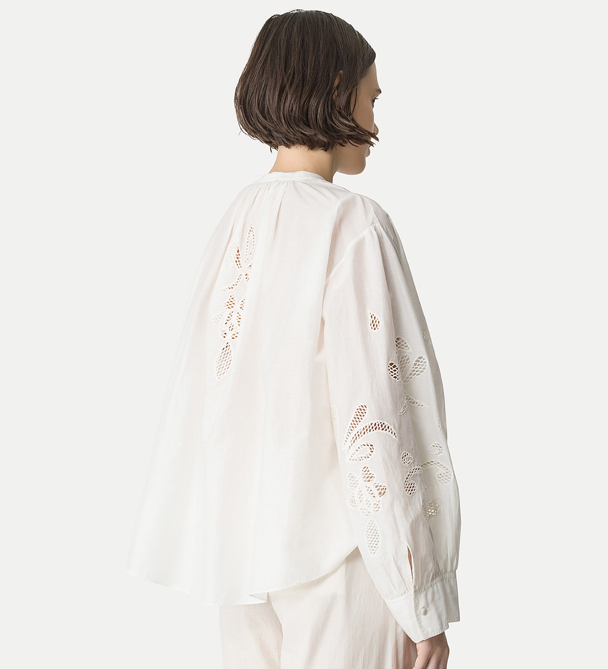 like precious secrets revealed by the tides, the “lunamaris” embroidery of shells decorates this bohemian blouse in cotton and silk voile. its iconic loose silhouette and gathered neckline enhance its artisanal charm. the intricate handmade embroidery tells a story of spring shores and wild gardens — a poetic blend of irises, peonies, and seashells illuminated by glass beads and tiny hand—knotted details.