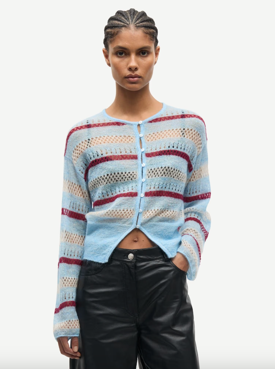 Semi-sheer cardigan with a slim fit and cropped length. Button closure on the front. Rib-knitted cuffs and hem. Round neck. Brushed look. Main material made from a blend of mohair, wool, and recycled polyamide.