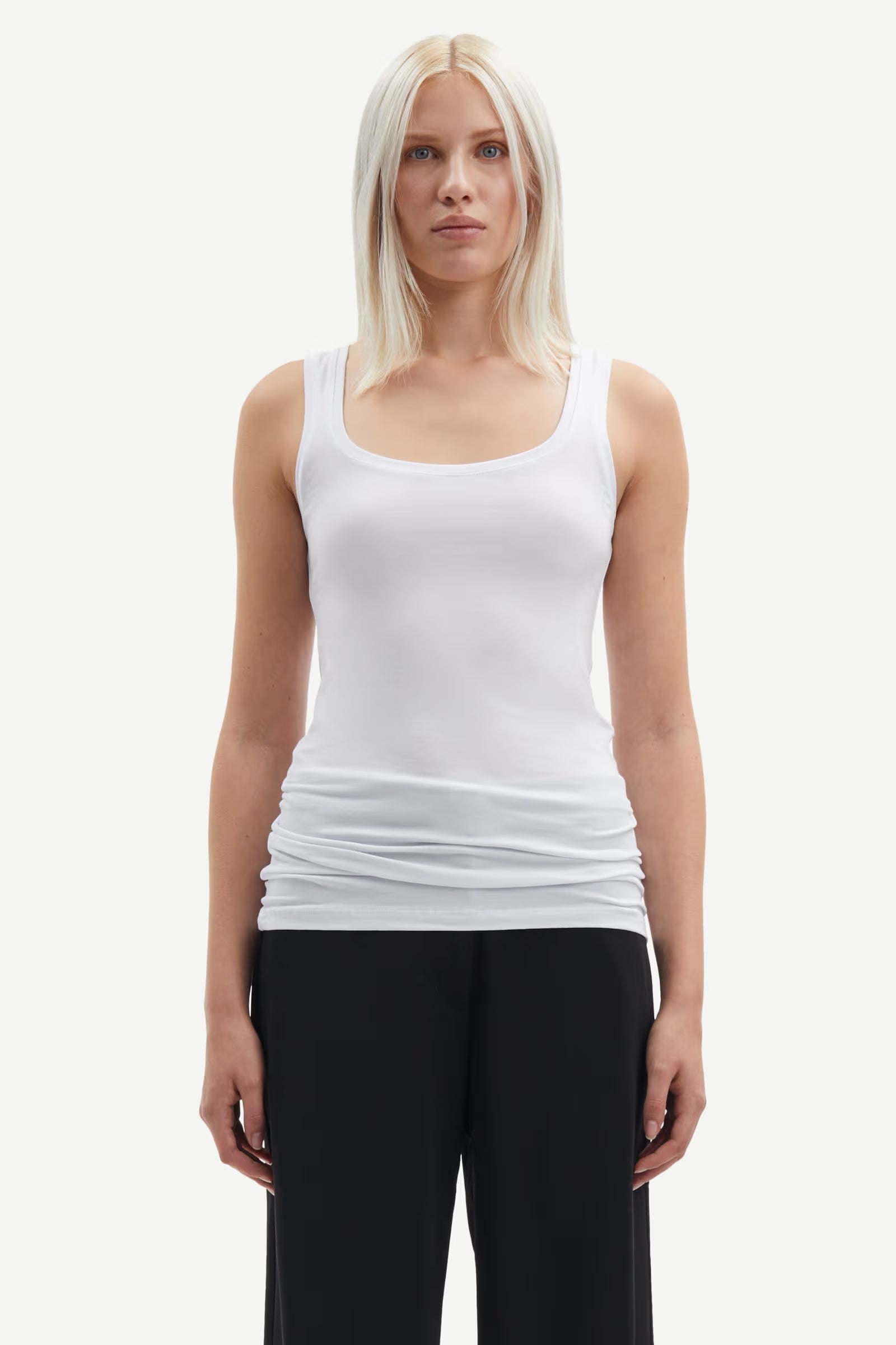 This Samsøe Samsøe classic tank top has a scooped front neck line and a higher back neck. Made in cotton Modal blend jersey with added stretch. This vest top is a core piece.