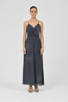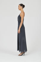 The Flicker Maxi Slip Dress is refined yet effortless. Cut with a slim bodice that gathers softly through the bust, it falls to a fluid maxi-length hem with a gentle flare. A clean V-neckline and in-house designed sequin pattern bring quiet detail to an otherwise minimal silhouette.