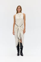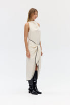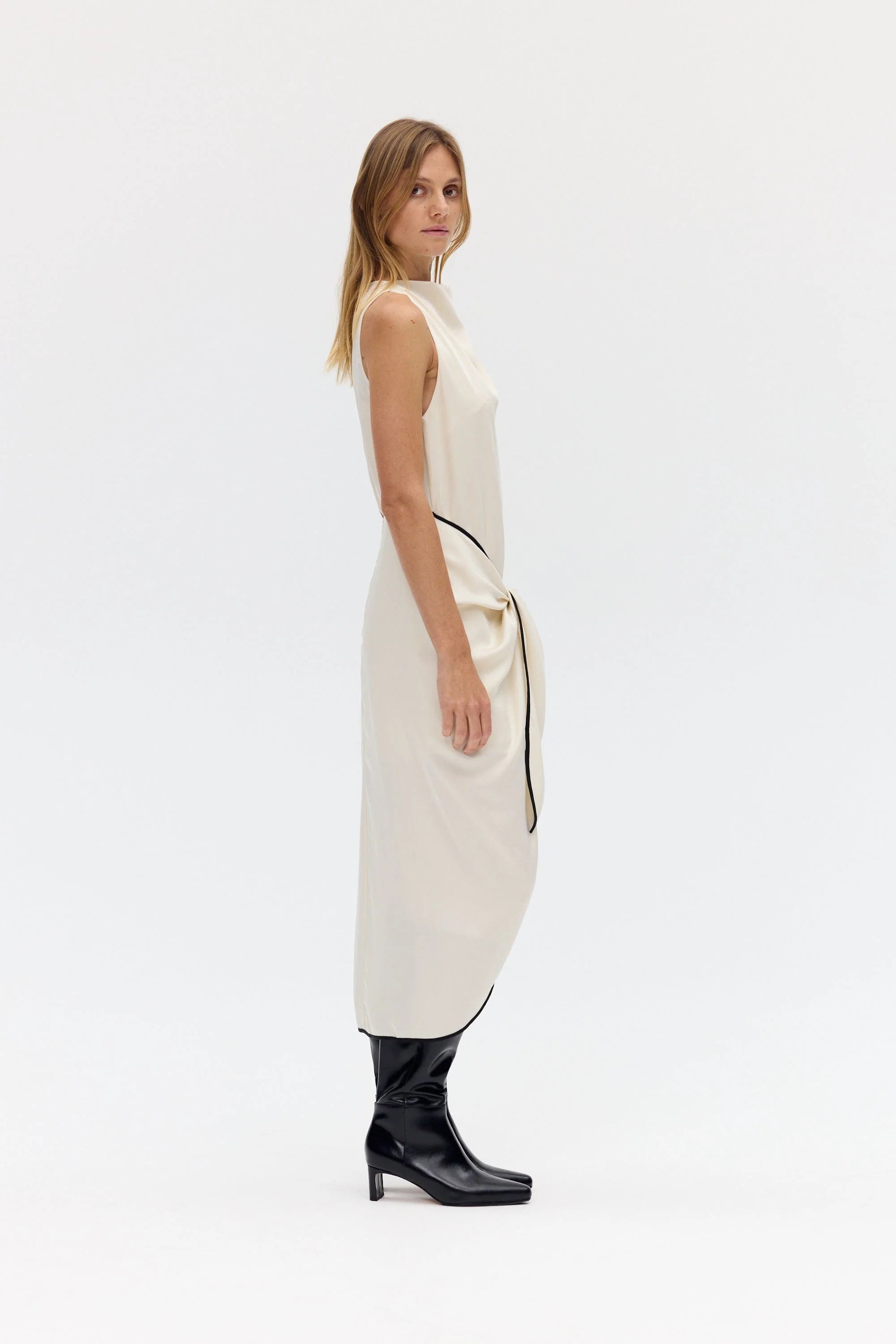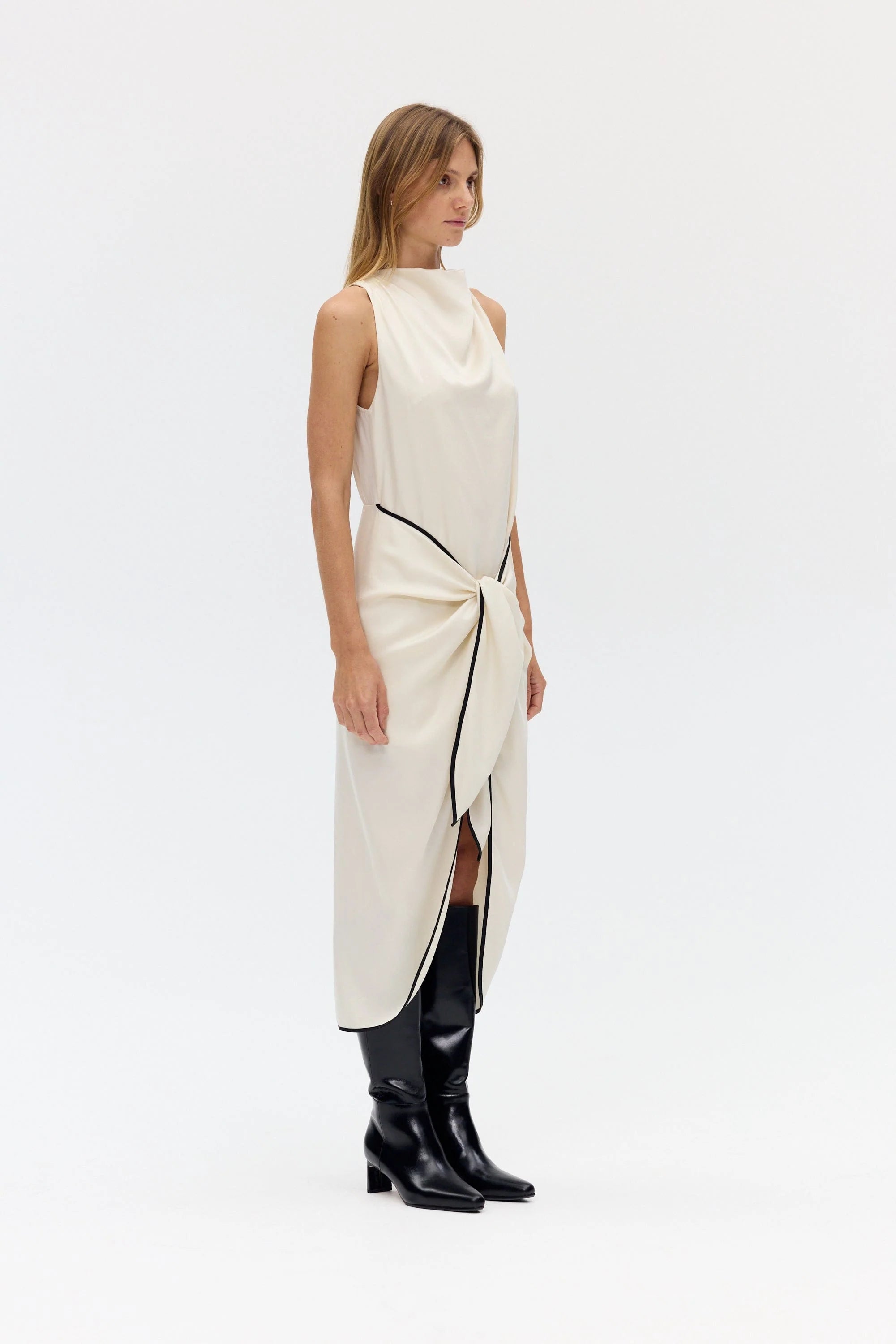 The Linger Tie Midi Dress is defined by soft drape and considered detail. Featuring a high neckline with subtle tucks through the shoulders, the silhouette falls with ease to a tie-front skirt that creates shape and movement. A contrast bind traces the edges, highlighting the wrap detail and adding a refined point of distinction.