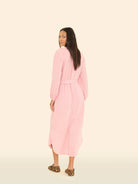 Pretty Please. Josephine is new this season in our washed double faced cotton gauze for a soft, gently crinkled feel. This V-neck midi dress is detailed with braided trim at the neckline, blouson sleeves, a rounded hem, a self-tie belt, and side seam pockets.