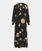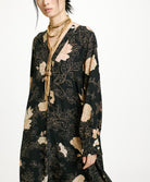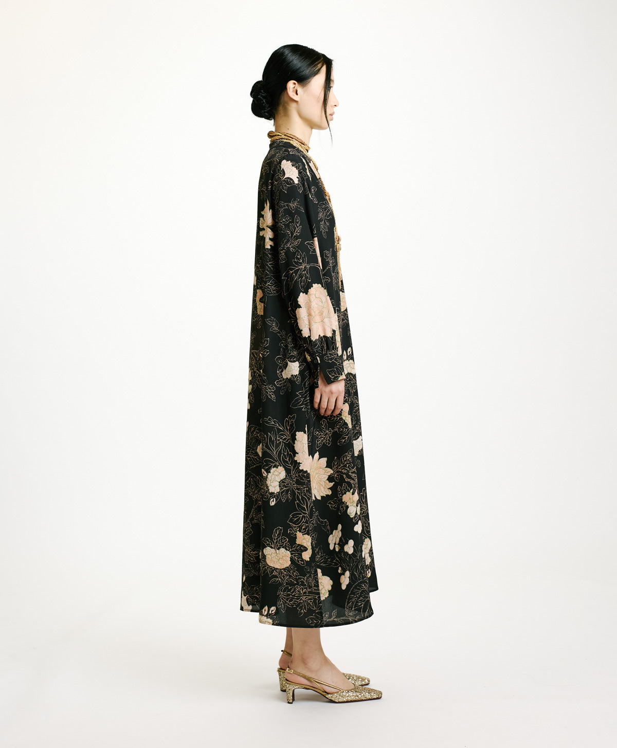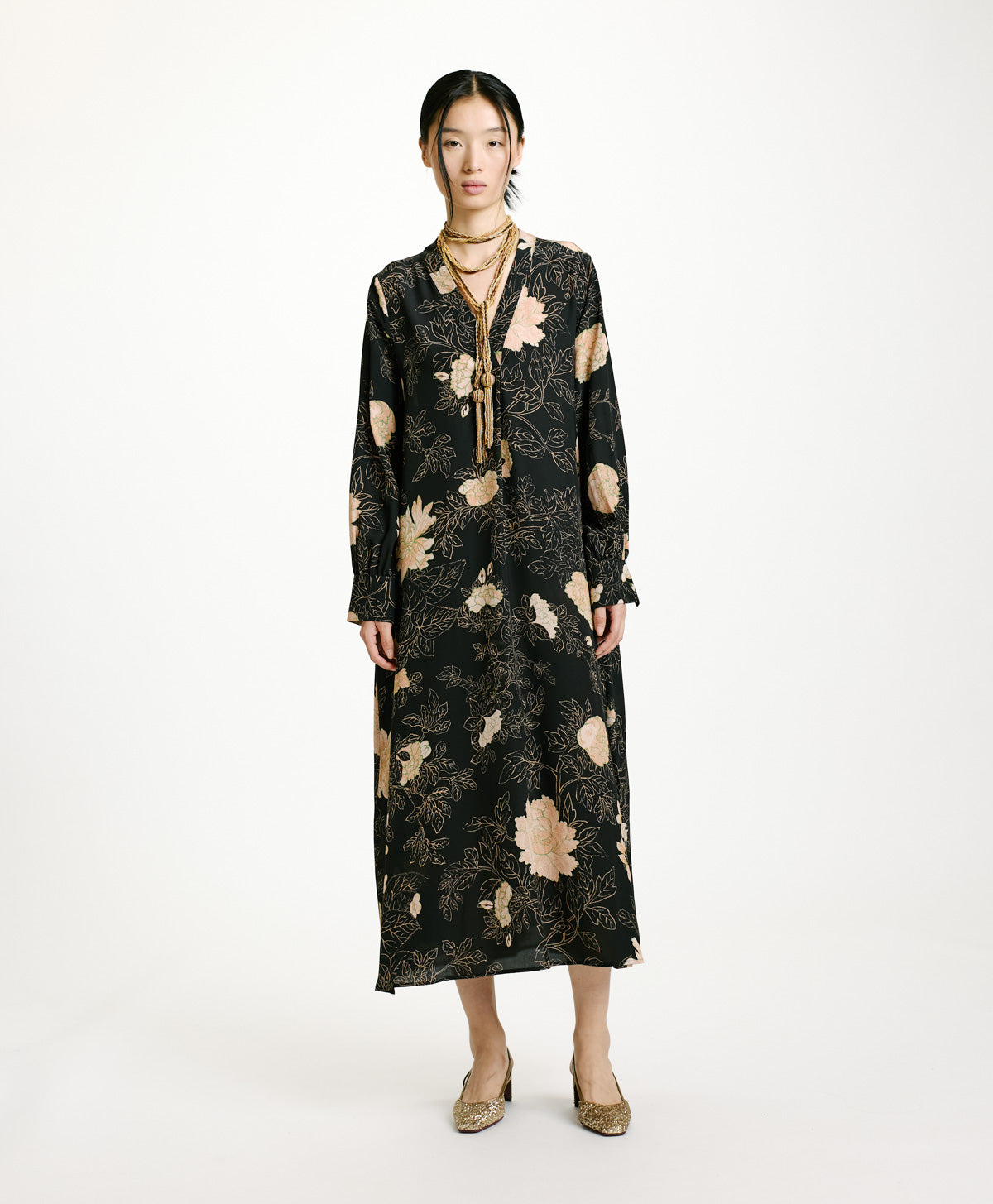 Printed silk crepe de chine flared tunic with polo-shirt V neck without buttons and central pleat to give volume. Long sleeves with deep cuff fastened with small button and elastic loop. In-seam side pockets.